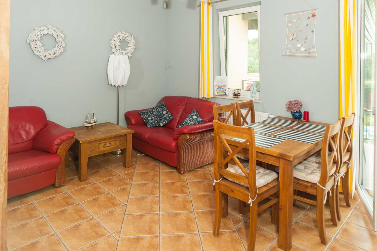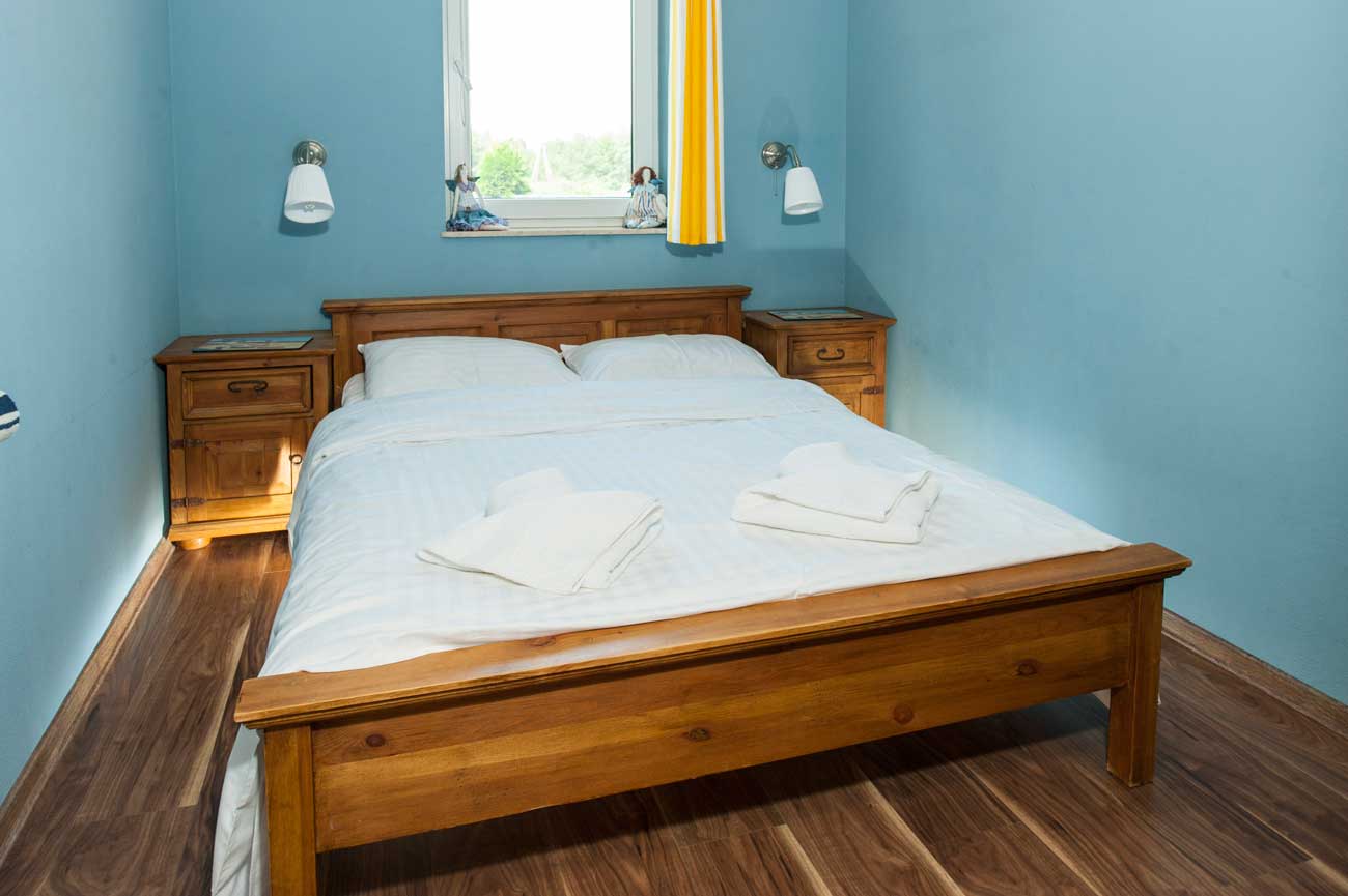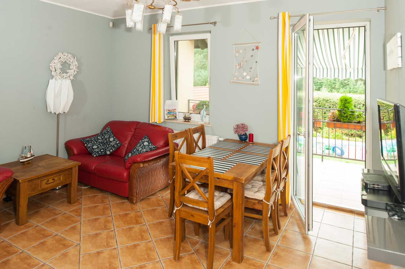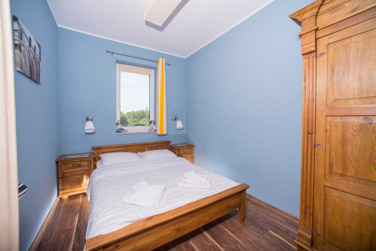 Apartament Bosmański składa się z salonu, aneksu kuchennego, sypialni z łóżkiem małżeńskim, sypialni z łóżkiem piętrowym dla 3 osób i dużej łazienki. Aneks kuchenny w apartamencie Bosmańskim wyposażony jest w zmywarkę, lodówko-zamrażarkę, płytę ceramiczną, toster, ekspres ciśnieniowy do kawy, pełną zastawę kuchenną i stołową. W salonie znajdziecie Państwo drewniany stół z pięcioma krzesłami, wygodną skórzaną sofę z poduszkami i fotel, drewnianą witrynę, drobne meble drewniane, dodatki morskie, telewizor plazmowy z telewizją na kartę, DVD. Pierwsza sypialnia dysponuje dużym podwójnym, drewnianym łóżkiem małżeńskim, szafą wraz z stolikami nocnymi, widok z sypialni na ogród i basen. Druga sypialnia składa się z piętrowego łóżka dla trzech osób (dół 140 cm x 200 cm, góra łóżka 90 cm x 200 cm), stolika nocnego i szafy. Łazienka w tym apartamencie wyłożona jest kolorowymi płytkami mozaikowymi, wyposażona w kabinę prysznicową.