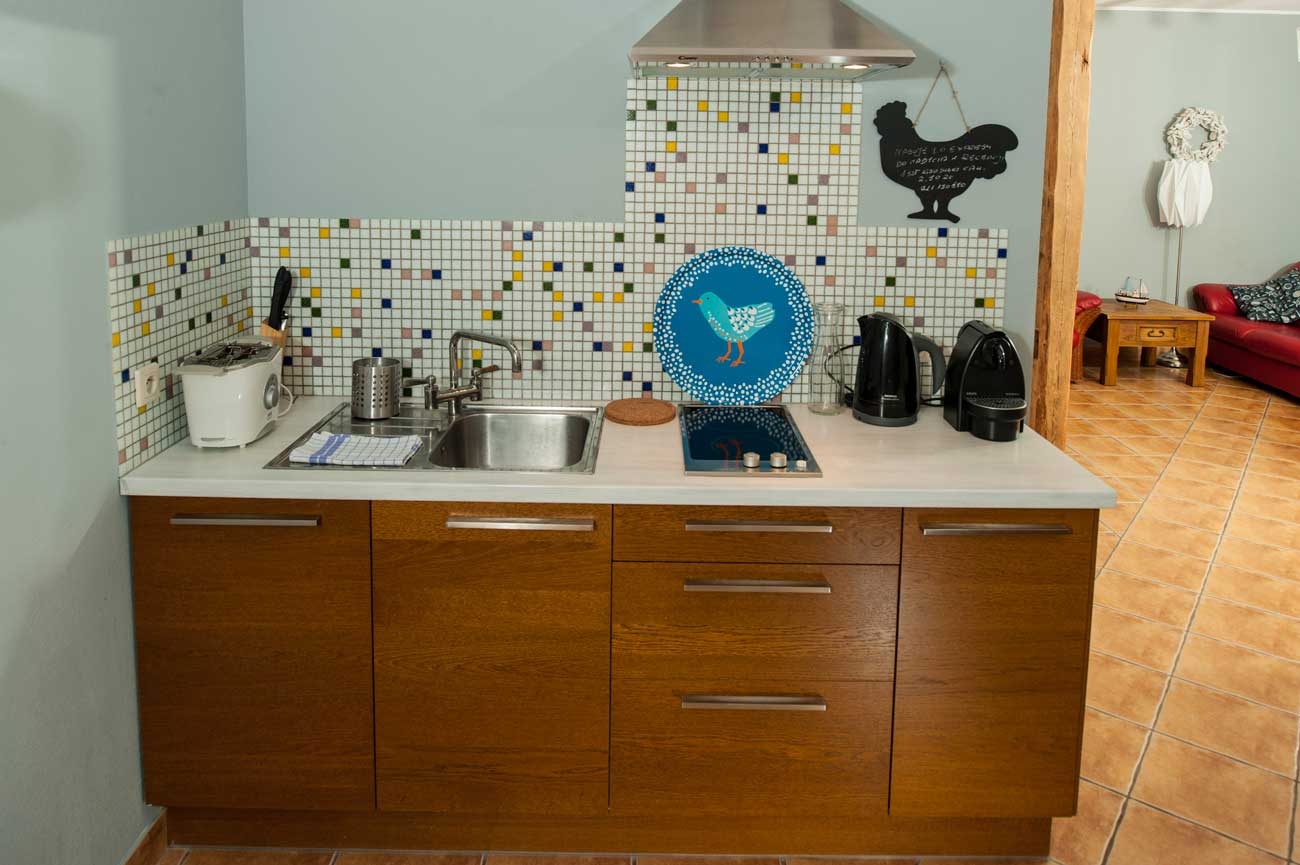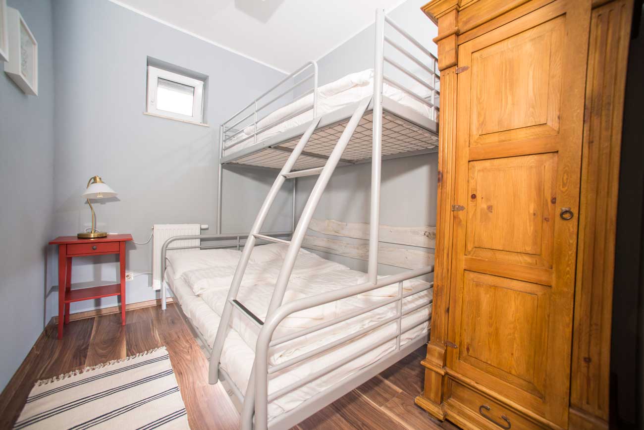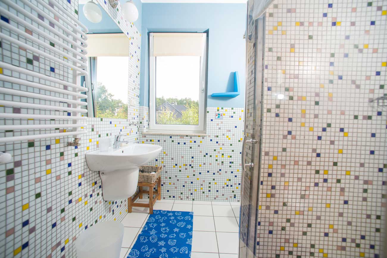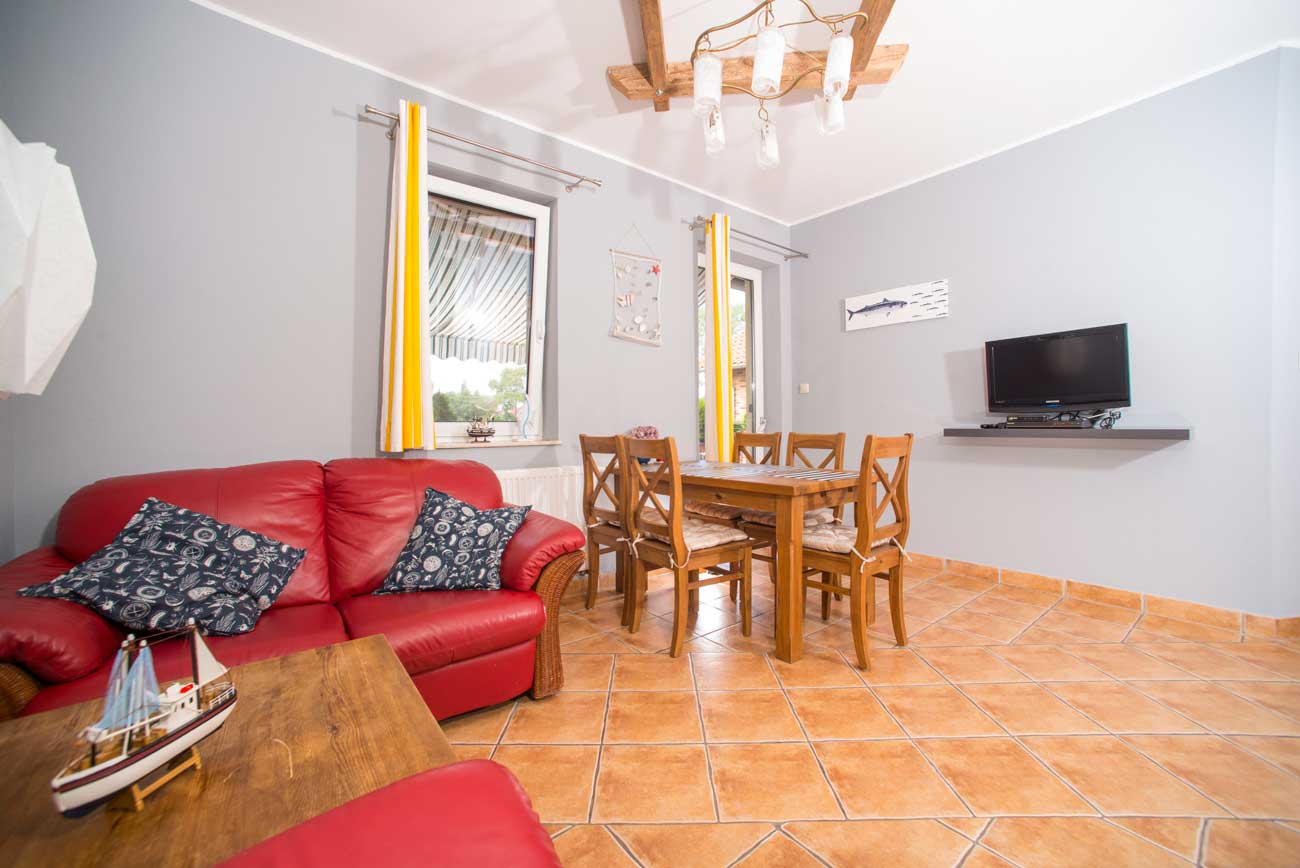 Apartament Bosmański składa się z salonu, aneksu kuchennego, sypialni z łóżkiem małżeńskim, sypialni z łóżkiem piętrowym dla 3 osób i dużej łazienki. Aneks kuchenny w apartamencie Bosmańskim wyposażony jest w zmywarkę, lodówko-zamrażarkę, płytę ceramiczną, toster, ekspres ciśnieniowy do kawy, pełną zastawę kuchenną i stołową. W salonie znajdziecie Państwo drewniany stół z pięcioma krzesłami, wygodną skórzaną sofę z poduszkami i fotel, drewnianą witrynę, drobne meble drewniane, dodatki morskie, telewizor plazmowy z telewizją na kartę, DVD. Pierwsza sypialnia dysponuje dużym podwójnym, drewnianym łóżkiem małżeńskim, szafą wraz z stolikami nocnymi, widok z sypialni na ogród i basen. Druga sypialnia składa się z piętrowego łóżka dla trzech osób (dół 140 cm x 200 cm, góra łóżka 90 cm x 200 cm), stolika nocnego i szafy. Łazienka w tym apartamencie wyłożona jest kolorowymi płytkami mozaikowymi, wyposażona w kabinę prysznicową.