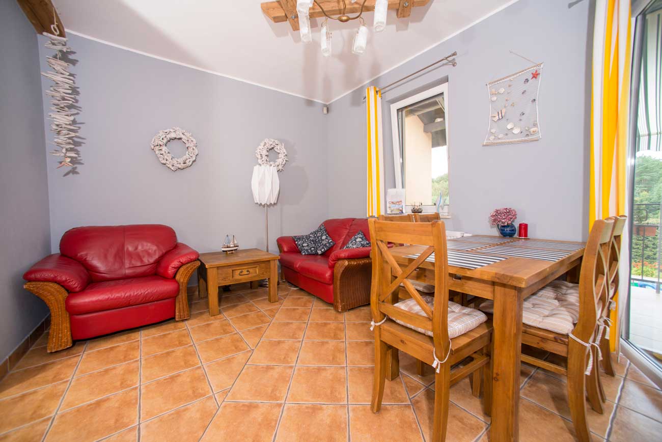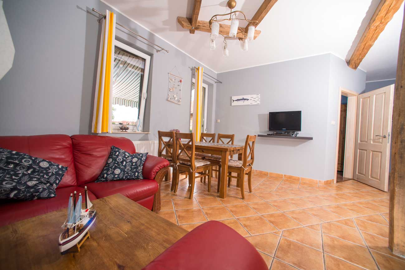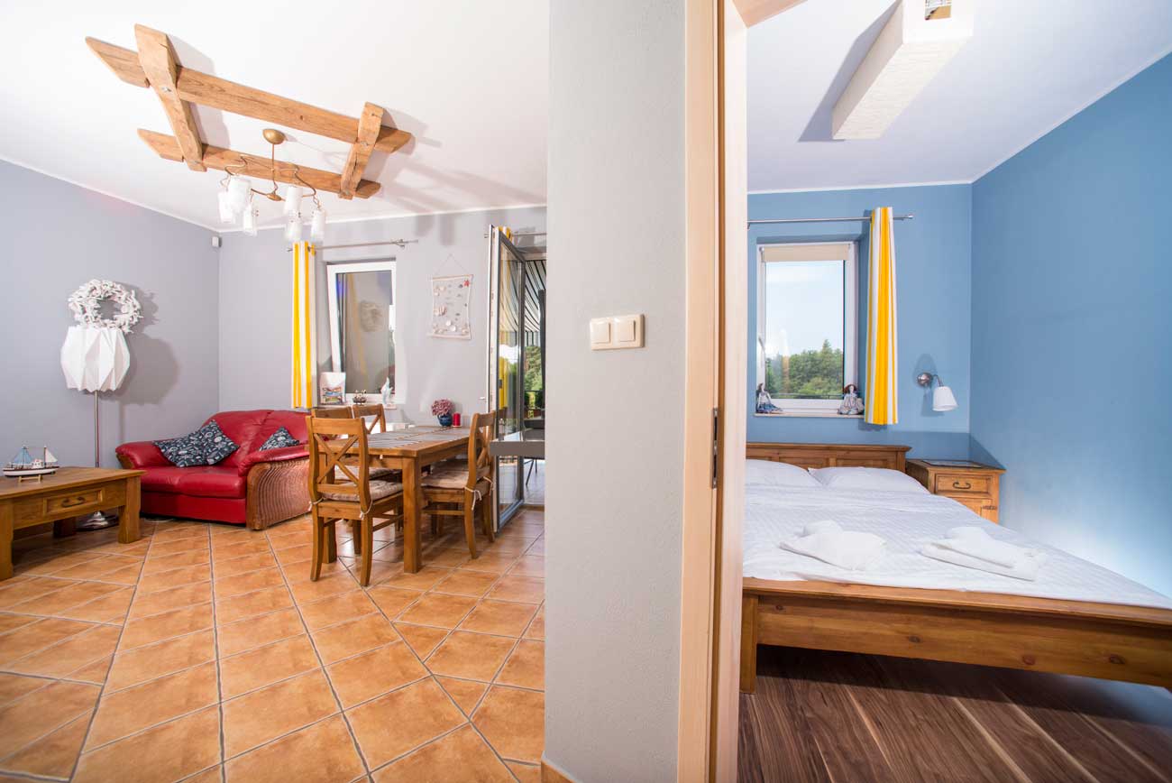 Apartament o powierzchni około 60 m², 3 pokojowy, znajduje się na piętrze, posiada indywidualne wejście, niewątpliwym atutem tego apartamentu jest bardzo duży taras z widokiem na ogród i basen. Taras jest wyposażony w meble ogrodowe i parasol przeciwsłoneczny. Apartament bardzo przestronny, klimatyczny, wyposażony w meble rustykalne, utrzymany w stylistyce morskiej, nawiązującej do położenia Villa Mare.