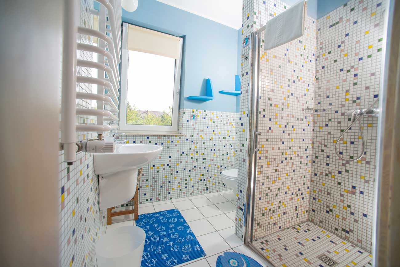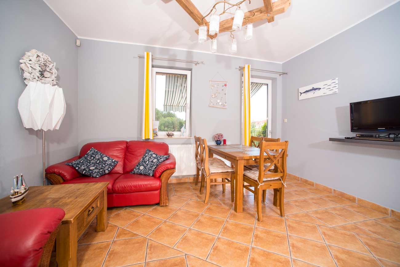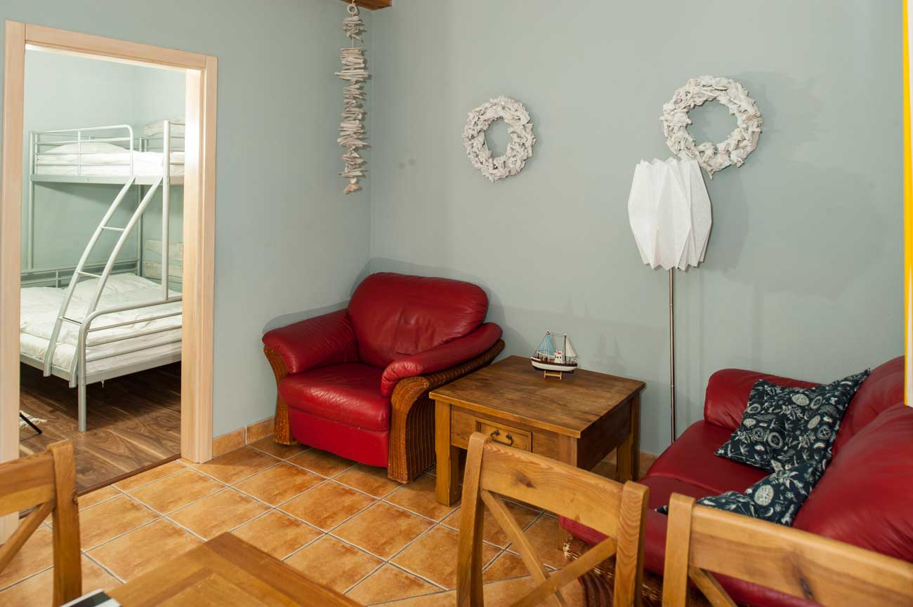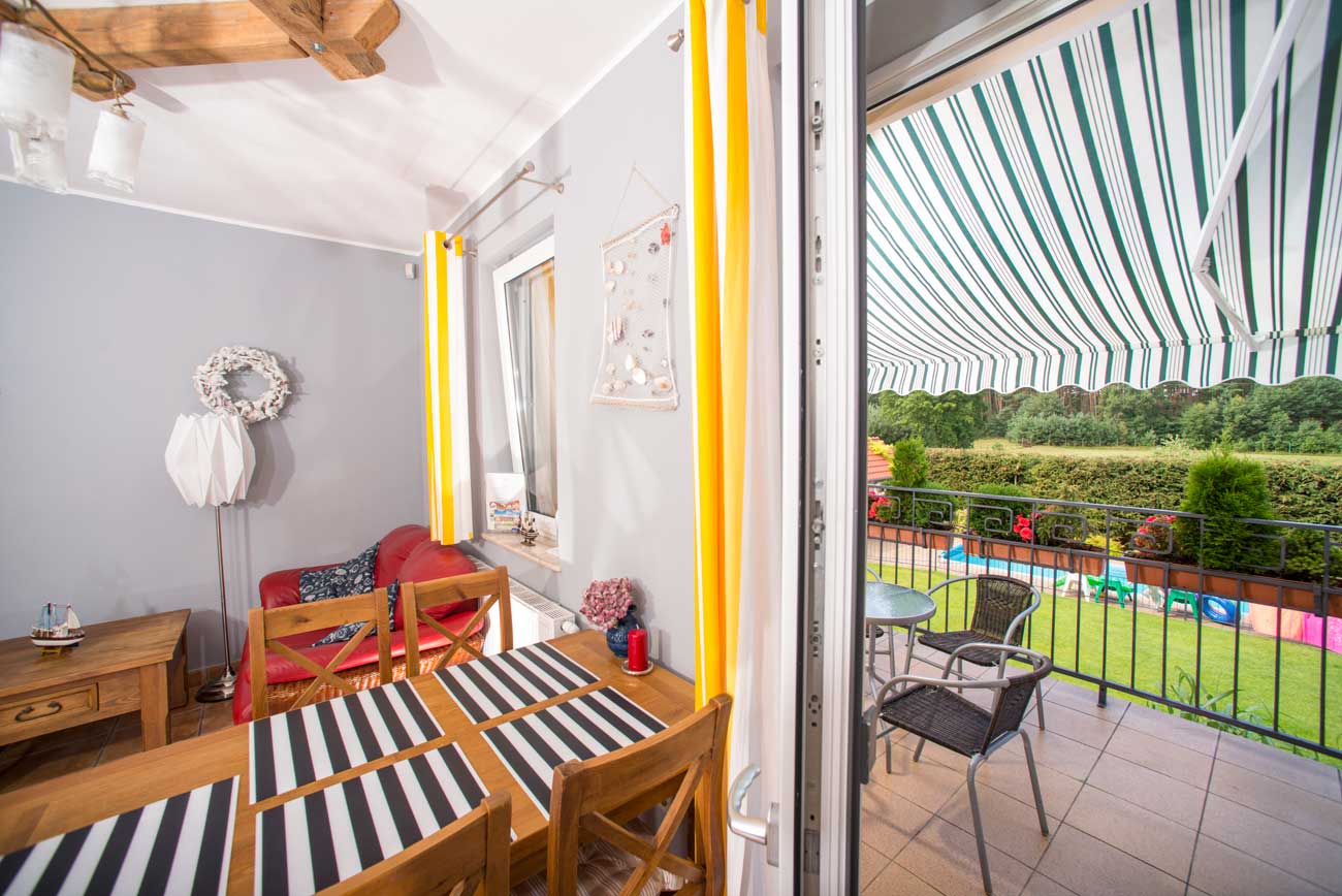 Apartament o powierzchni około 60 m², 3 pokojowy, znajduje się na piętrze, posiada indywidualne wejście, niewątpliwym atutem tego apartamentu jest bardzo duży taras z widokiem na ogród i basen. Taras jest wyposażony w meble ogrodowe i parasol przeciwsłoneczny. Apartament bardzo przestronny, klimatyczny, wyposażony w meble rustykalne, utrzymany w stylistyce morskiej, nawiązującej do położenia Villa Mare.