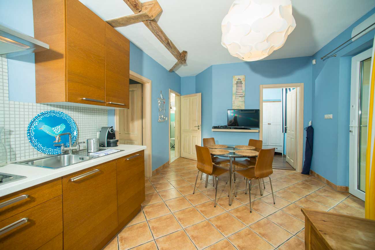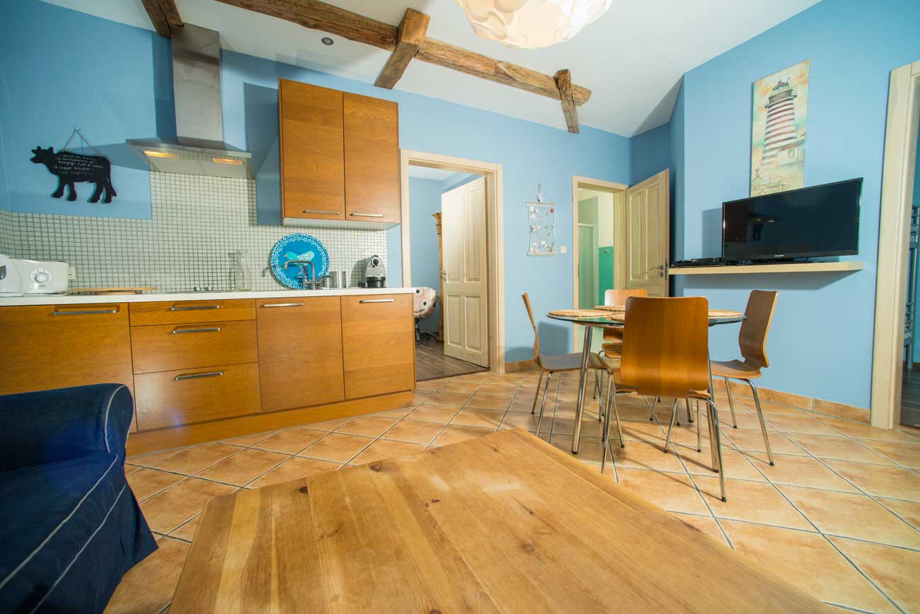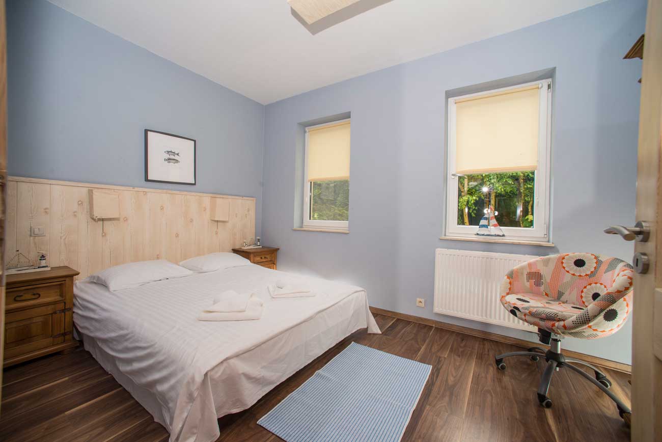 Aneks kuchenny jest wyposażony w zmywarkę, lodówko-zamrażarkę, płytę ceramiczną, toster, ekspres ciśnieniowy do kawy, pełną zastawę kuchenną i stołową. W salonie znajdziecie Państwo sofę, szklany nowoczesny stół z czterema krzesłami, drobne meble drewniane, telewizor plazmowy z telewizją na kartę, DVD. Pierwsza sypialnia dysponuje dużym podwójnym, drewnianym łóżkiem małżeńskim, szafą wraz z stolikami nocnymi, widok z sypialni na ogród. Druga sypialnia wyposażona jest w piętrowe łóżko ( 90 cm x 200 cm) oraz szafę, widok z okna na basen i ogród. Łazienka w tym apartamencie jest bardzo przestronna, wyposażona w kabinę prysznicową.